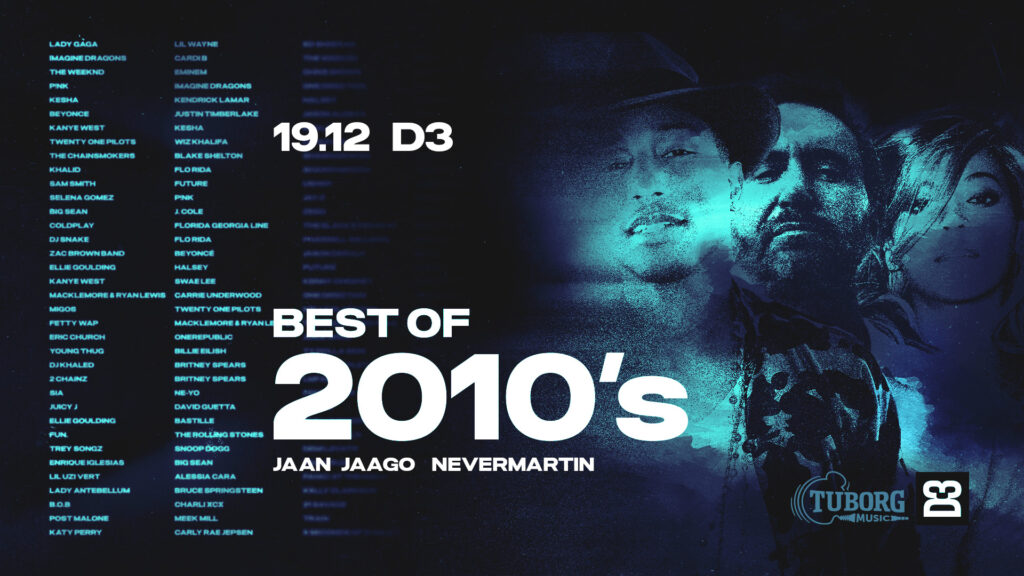 Just 2010ndate hitid on need, mis ei puudu ühestki korralikust peo playlistist. Miley Cyrus, Lady Gaga, Demi Lovato, Selena Gomez, Justin Bieber, Drake, Ariana Grande, One Direction… see on vaid väga lühike nimekiri artiste, kelle muusika järgi just 2010ndate peol tantsida saad!